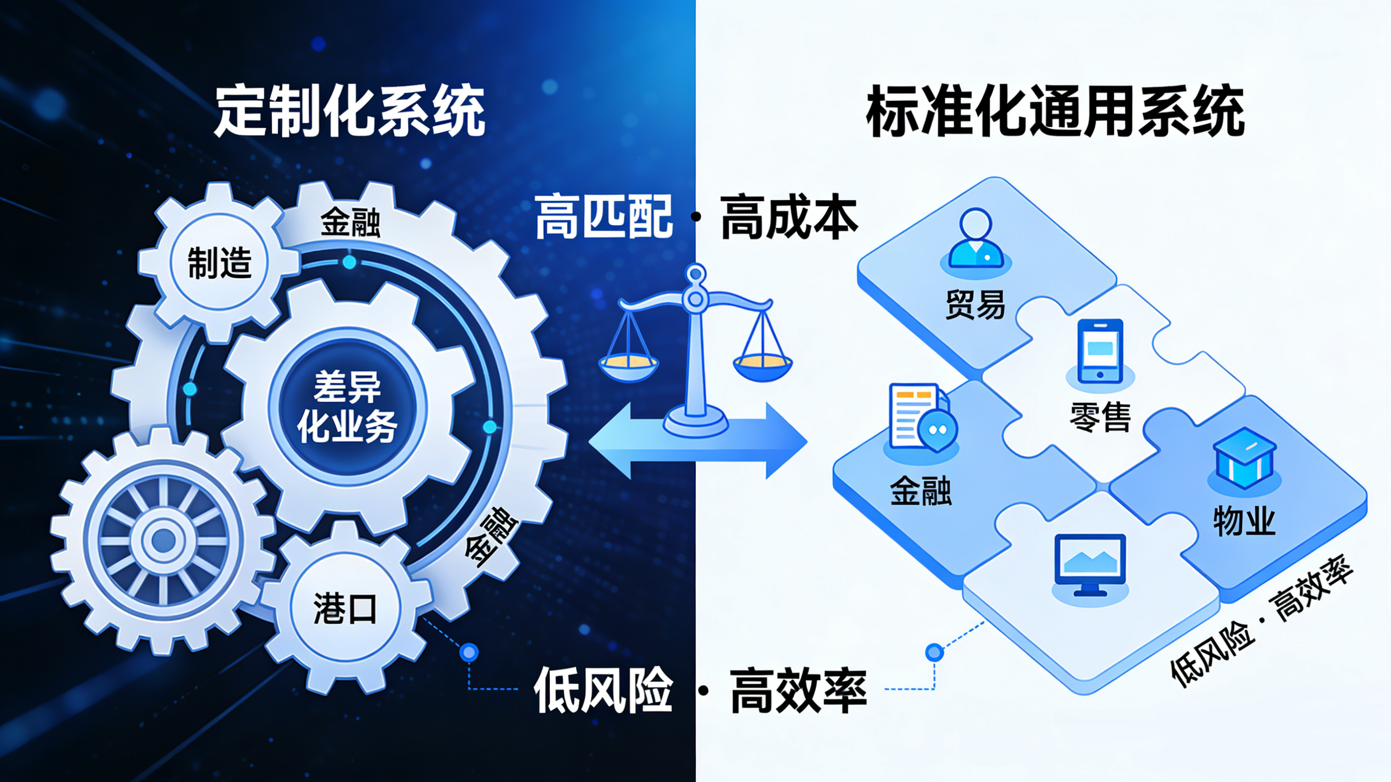 我做过不少企业的ERP项目,也完整落地过十几个制造、餐饮、港口码头、物业等多个行业的项目。从中发现,不同行业、不同性质企业,在选系统时,面对应该选定制开发还是通用系统这个问题时,给出的答案往往大相径庭。